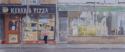 A contemporary view of window reflections, signs and suburban architecture from a lively part of Hitchin town known locally as 'Takeaway Corner' . This piece is sold framed. For framing options and shipping costs please get in touch.
